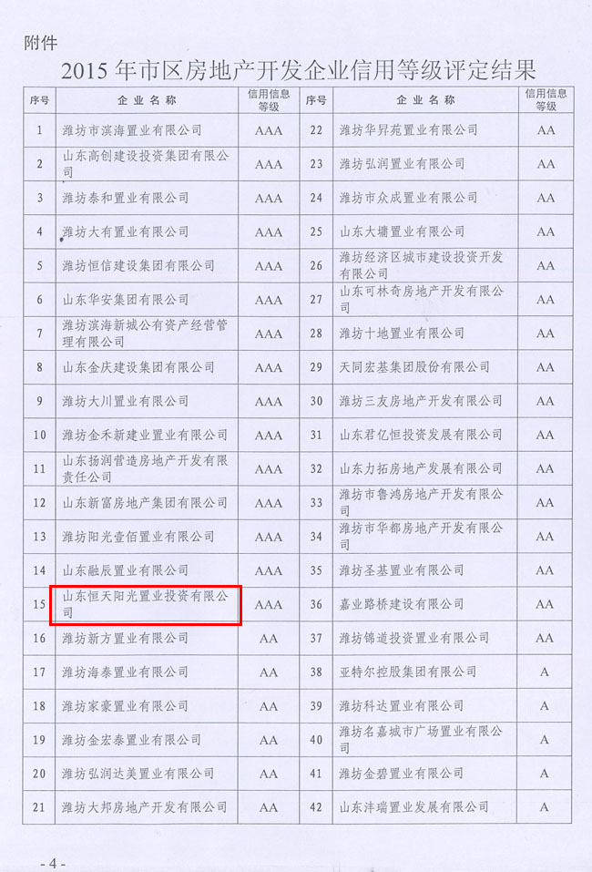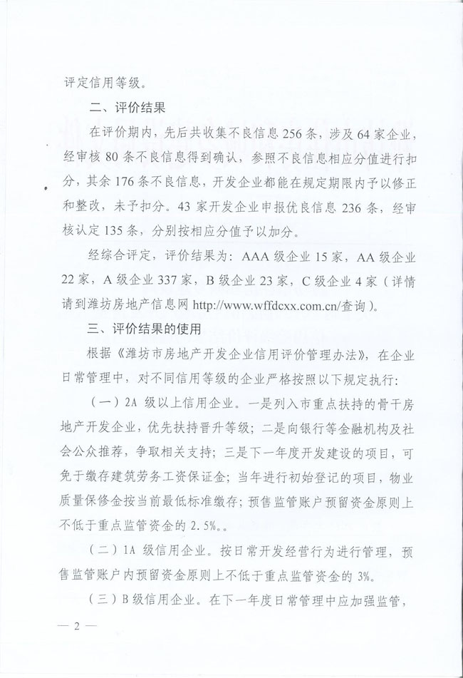 附件:《潍坊市住房和城乡建设局关于对2015年度市区房地产开发企业信用等级评价结果的通报》(潍建开字[2016]2号)