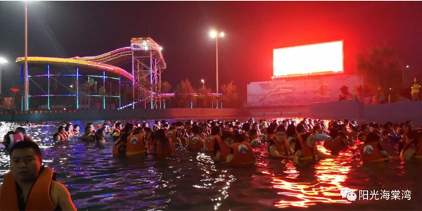 饭后的天色暗了下来,乐园中灯光开启,更加璀璨夺目,演艺活动也是精彩纷呈,刚刚吃饱,大家都选择了不是特别刺激的项目,随着DJ的指挥在造浪池中随波逐流。