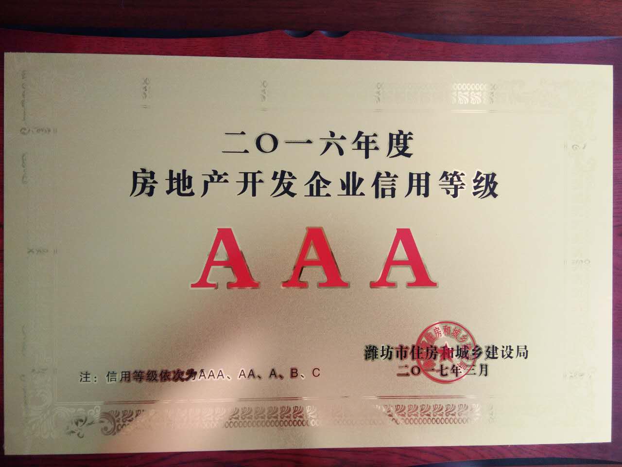 我公司荣获2016年度市区房地产开发企业信用等级AAA级荣誉