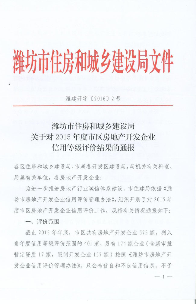 公司荣获2015年度市区房地产开发企业信用等级AAA级荣誉